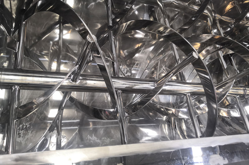 工作原理:卧式螺带混合机由搅拌装置、传动装置和机座构成,以其高效的混合性能为特点。搅拌装置,混合机的核心,包括主轴和双层螺带,负责原料的均匀混合。传动装置,由电机和减速器组成,提供必要的动力以驱动主轴旋转。机座则稳固地支撑整个混合机。工作时,螺带和搅拌叶片通过旋转摩擦力使原料在对流层中均匀混合,同时螺带推动原料沿轴向流动,实现全方位混合。这种设计使卧式螺带混合机特别适用于粉体与粉体、粉体与液体的混合任务。